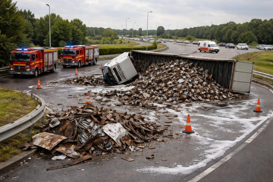 Un tir încărcat cu deșeuri metalice s-a răsturnat în sensul giratoriu dintre strada Lânii și Varianta de Ocolire a Brașovului, blocând temporar accesul spre Centură. Incidentul a avut loc pe 20 aprilie 2026, iar intervenția autorităților a durat aproximativ trei ore.
